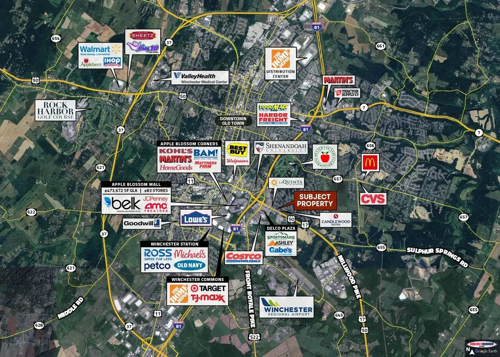 Highly visible 1.38 acre parcel (200’ W x 300’ D) overlooking a diverse retail area including Costco. A geotechnical report and Phase 1 environmental are available along with a full ALTA survey. Strong commercial hub with a mix of retail stores, restaurants, and service-oriented businesses. This variety produces a broad customer base and generates daily traffic to the immediate area. The site is located on a heavily used Millwood Pike with convenient access to Interstate 81. Daily traffic on this portion of Millwood Pike is 21,000 vehicles making it one of the top roads in the market. Winchester is one of the fast growing metro areas in the Commonwealth of Virginia with population growth projected to increase 12.7% over the next decade. Along with Frederick County, Virginia, the metro area is one of the fastest growing in the Commonwealth of Virginia. The city’s employment landscape spans various sectors, offering private sector jobs in agriculture, forestry, manufacturing, retail, professional services, education, and healthcare. The leading employer, Valley Health Systems, operates the Winchester Medical Center—a non-profit, regional referral hospital and Level II trauma center that serves the tri-state region.